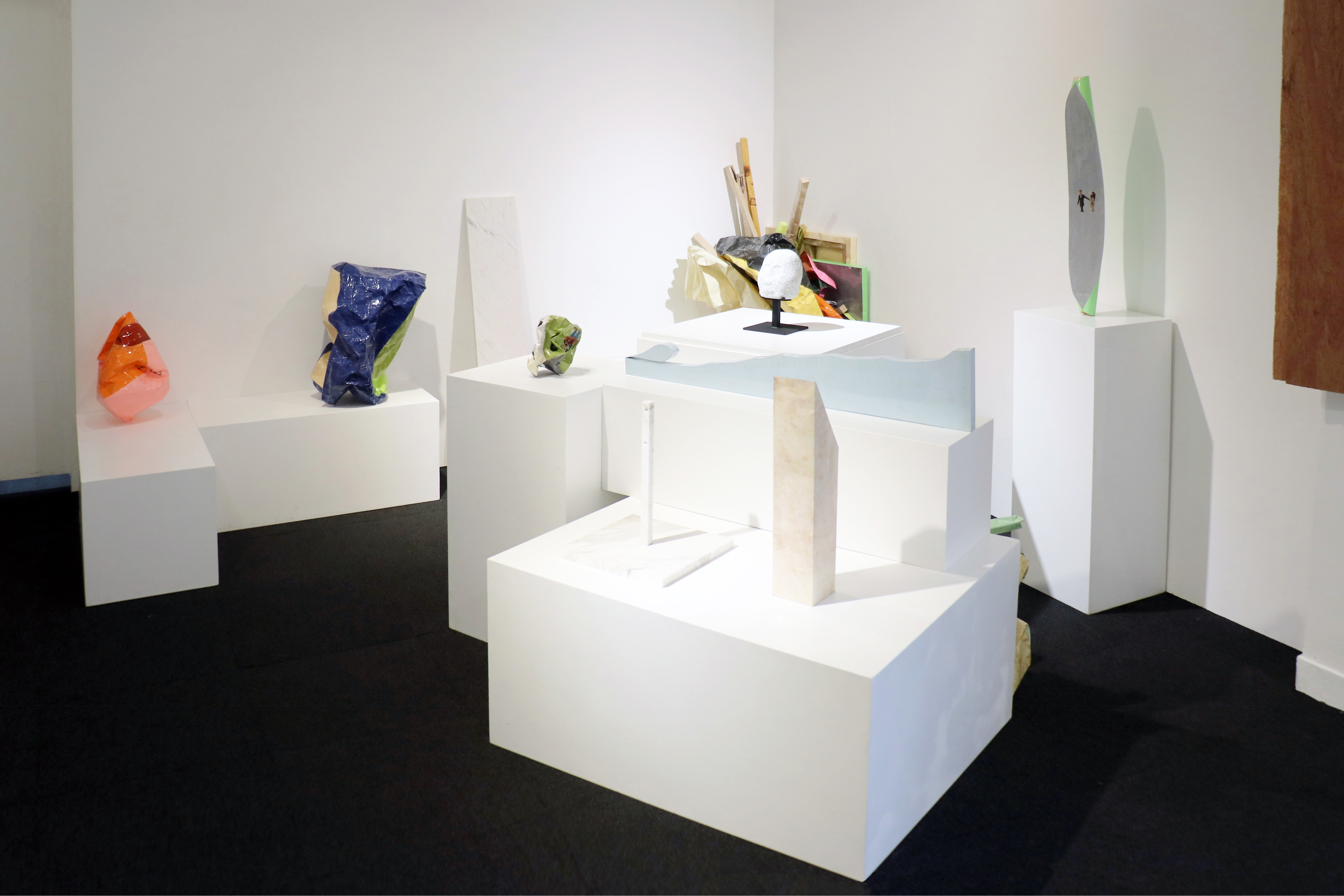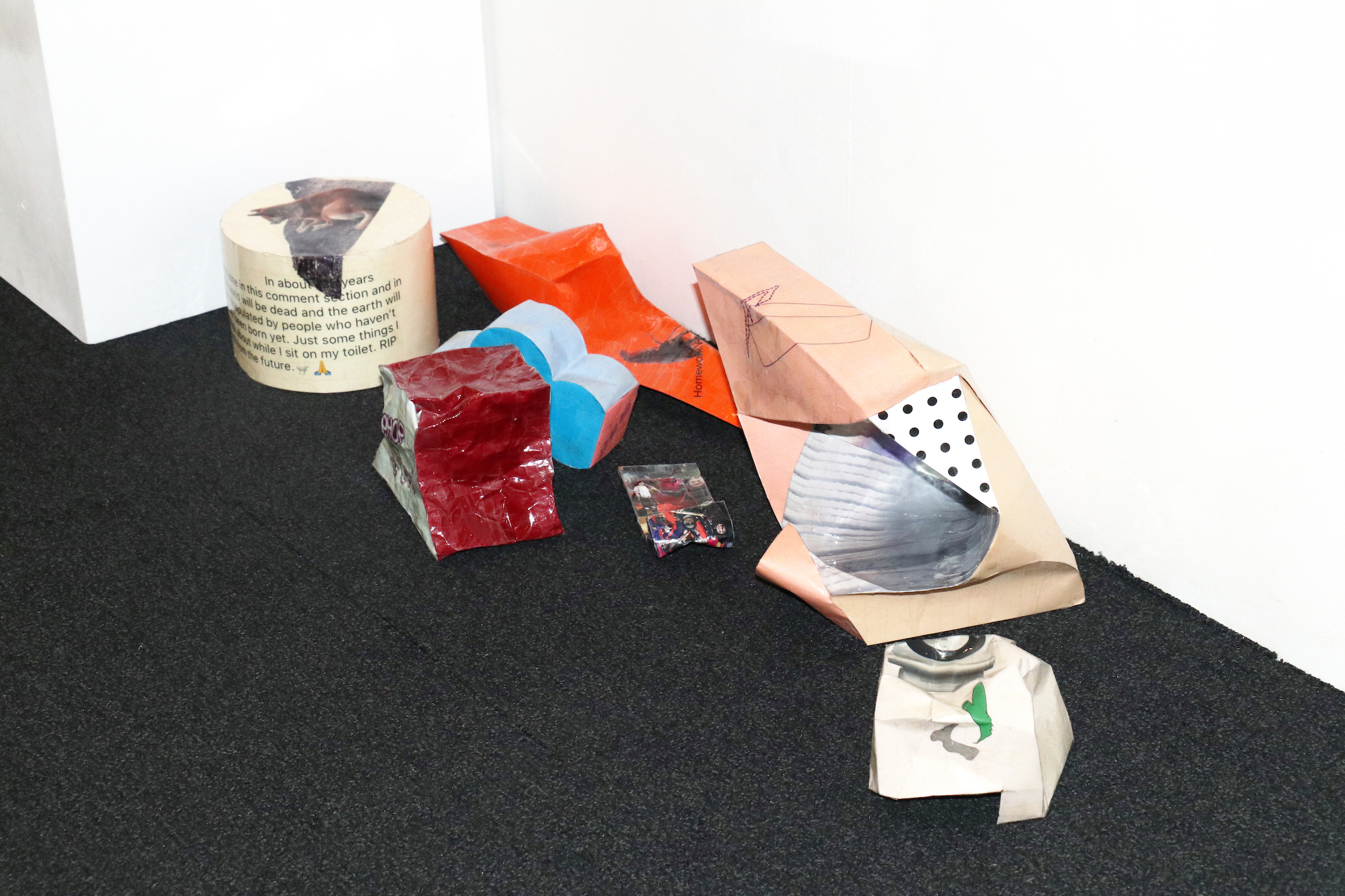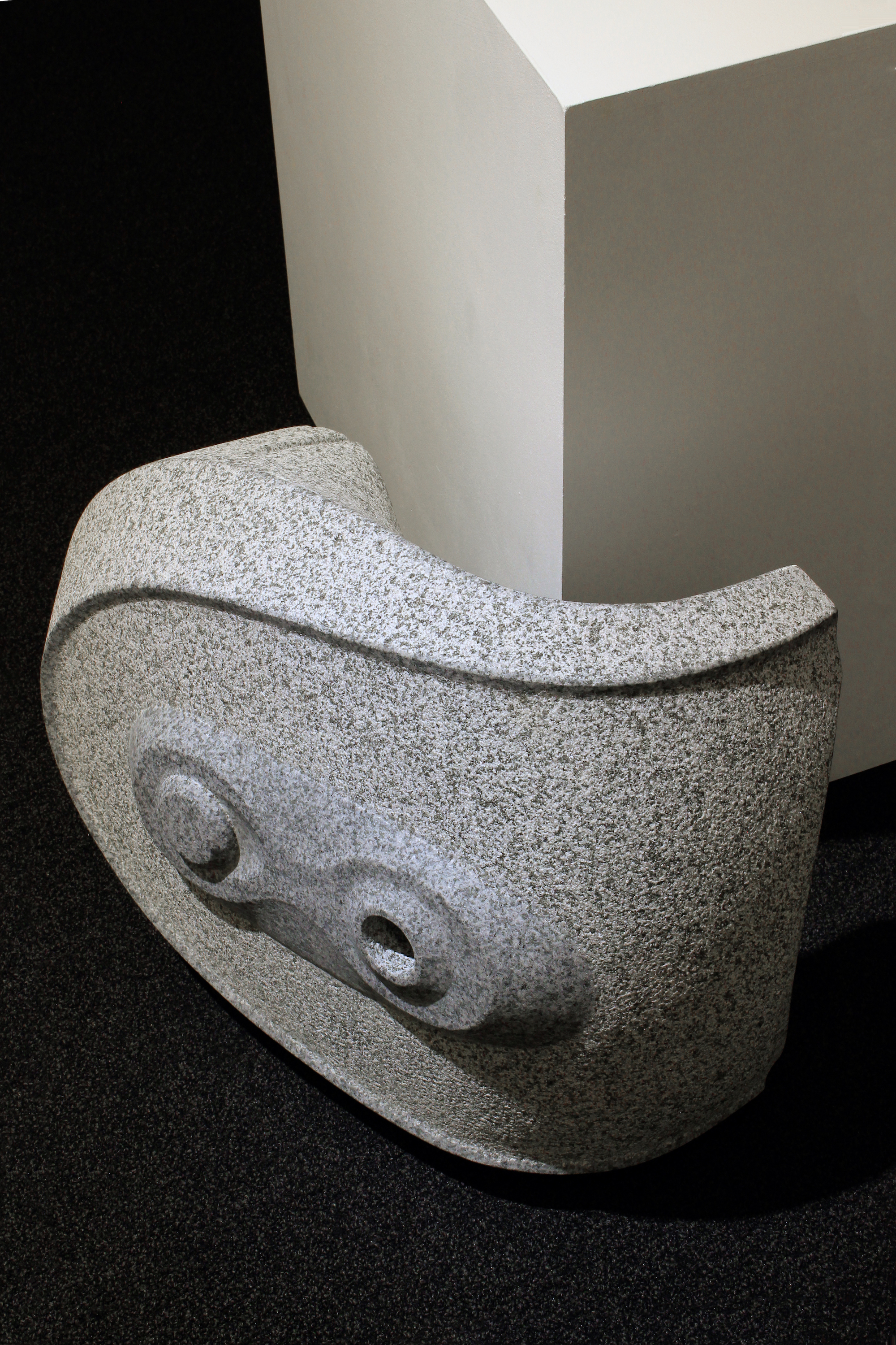 한편 작품자체에 동반되는 시간성이 존재한다. 이를 기념비적인 것들―미래를 내다보는 혹은 미래가 이미 도착한 것―이라 하자. 필자가 앞으로 살펴볼 시간성은 기념비적 시간성이다. 이번 전시에서 홍기하의 작업은 미래를 내다보는 조각이라 할 수 있고, 반면 김문기의 작업은 미래가 이미 도착한 것으로 볼 수 있다. 먼저 홍기하의 작업에서 조형물은 주로 일상에서 보는 소재들을 단단한 돌로 만든 작업이다. 예컨대 ‘약 125년이 지나면 이 댓글 섹션에 있는 모든 사람들은 죽어있을 것이고 이 지구는 아직 태어나지도 않은 사람들로 채워져있을 것이다. 그냥 변기에 앉아서 생각해볼 거리. 미래의 당신들에게 명복을 빕니다.’라는 인스타그램 유머 포스팅의 문장과 아스키 아트(ASCII Art)처럼 보이는, 생각하는 인물의 모습을 문자로 이미지화한 온라인 상의 비물질적인 대상이나, 석고보드 텍스나 배너 거치대로 쓰이는 물통처럼 일상에서 마주보는 좌대와 같은 바탕들이다(도판1). 여기서 작가가 다루는 소재는 지금 시점에서는 일상에서 흔히 쓰이고 원래 조각이 아닌 것들이다. 작가는 그 대상을 외주 제작을 통해 무거운 재료로 보여준다. 여기서 시간성은 미래에 남을 수 있게 현재의 순간을 ‘미리’ 박제하여 단단한 물질로 정착시킨다. “플라스틱이 돌보다 오래 더 가는데?”라는 반론은 적절하지 않고, 오히려 작가는 궁극적으로 스치듯이 보는 대상을, 그렇게 경험하는 데에 무게중심을 부여하여 미래를 약속한다. 그의 작업에서 기념비성은 이미 사라졌거나 지나간 기억의 지표로 기능하기보다, 곧 사라질지도 모르는 대상을 조형물로 기록하여 미래로 향하는 시간을 약속한다. 반면 김문기의 작업은 연약하게 비춰져 기념비와 거리가 멀다고 생각될 수도 있다(도판2). 그런데 기념비가 일종의 시간적 지속을 위해 미래로 나아가는 일에 봉사한다면 찌그러진 형태는 이미 형태자체가 어떤 힘을 받았다는 결과로서 드러난다. 그의 작업은 어떤 힘을 받아 이미 구겨진 상태로 있으며 결과물로서 과거를 간직하고 있다. 그런 의미에서 김문기의 작업 또한 기념비적이다. 앞서 홍기하의 작업이 (미래로) 남기기를 위한 것이라면 후자는 남겨진 것들에 더 가깝다.