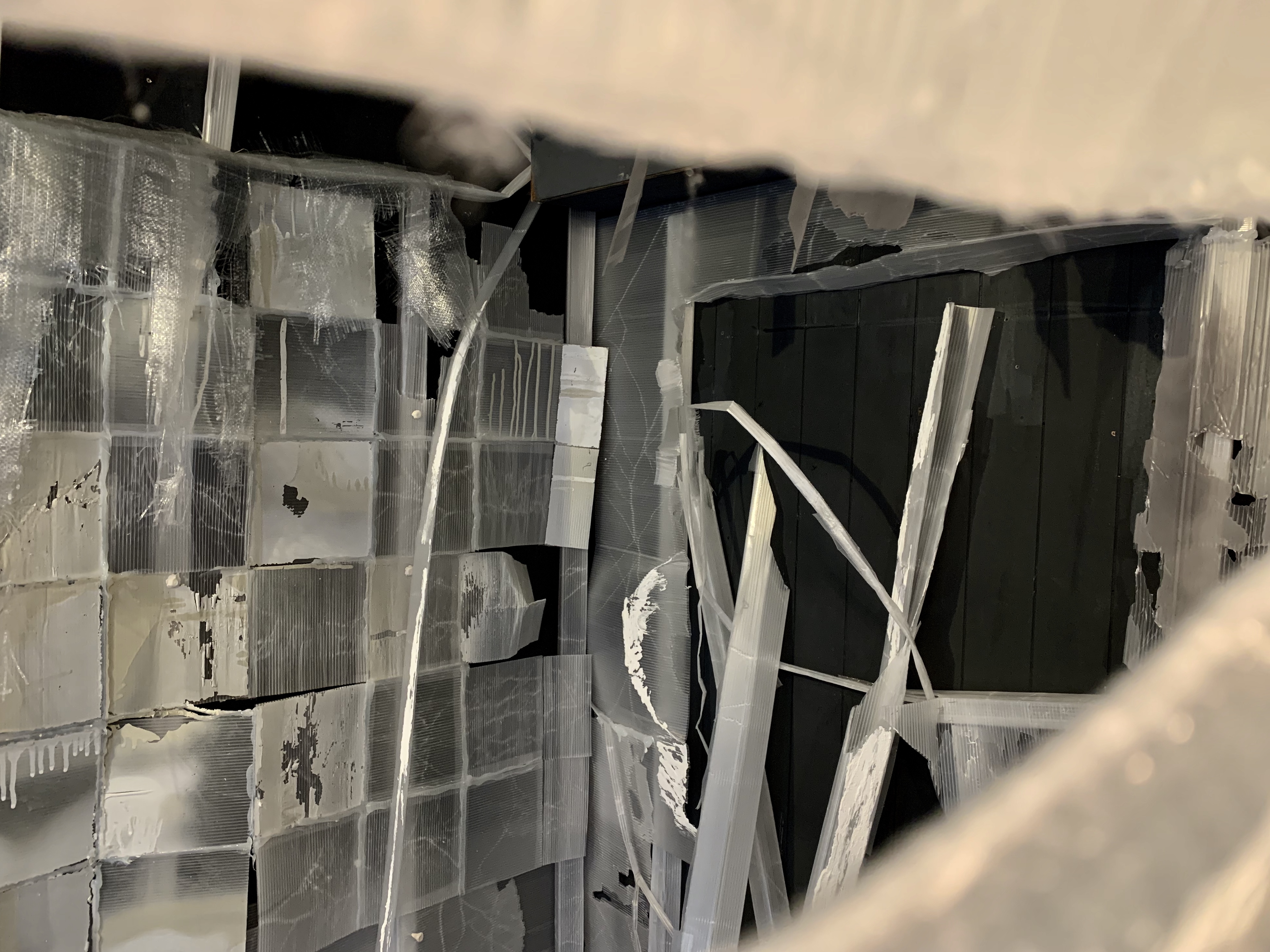 현실과의 괴리는 공간과 시간 모두 지금 이곳에 있지 않은 것을 의미하는데, 이는 작가가 다루는 폐허의 속성(이하 폐허성)과 관련이 깊다. 실제 공간에서 이탈된 스펙터클은 기록된 시간에서도 이탈되어 소비대상이 된다. 시간적 이탈은 폐허에도 나타난다. ‘지금 이곳’에 있는 폐허는 ‘과거의’ 지표로서 존재한다. 시간을 돌리면 폐허는 과거에 폐허로 있지는 않았고 그 말은 폐허는 애초에 폐허로 태어나지 않는 것을 의미한다. 시간의 경과를 거쳐 나타난 폐허는 원래 사람이 살고 있었다가 기능이 폐기되어 점차 썩어가면서 붕괴하는 공간이고, 동북대지진 관련해서는 어떤 사건과 피해의 지표적인 역할을 지닌다. 가랑이 찢어지듯 현재라는 위치에서 거리를 벌려 폐허는 시공간에서 이탈되어 과거로 등장하며 거리감을 통해 스펙터클로서 공유된다. 그의 작업에서 만들어진 폐허는 일차적으로 공간적인 거리/거리감을 통해, 그리고 이차적으로 시간에서 괴리된 폐허성을 통해 만들어진다. 그런데 폐허가 폐허로 태어나지 않는 것처럼 그의 작업은 폐허 자체를 만들지 못하고 오로지 전달되고 공유된 이미지의 표피나 허물을 떼어내듯이 제작된다. 전시공간을 압도하긴 하지만 그의 작업은 VR만큼 몰입할 수 없고 쓰나미의 영상기록, 더 나아가 전시장에 비치된 아이패드 속 사진보다 더 멀리 현실에서 떨어져 있다. 시공간 축에서 멀어진 폐허를 이번 전시를 통해 전시장에 재현하려는 그의 태도는 실재하는 폐허를 만드는 일에 실패하고 허물을 만든다. 이 부분이 바로 그의 작업의 핵심이다. 말하자면 작품은 스펙터클로 매혹시키고 폐허에 몰입시키지 않고 시공간적인 괴리감을 짚어주는 데에 방점이 찍힌다.